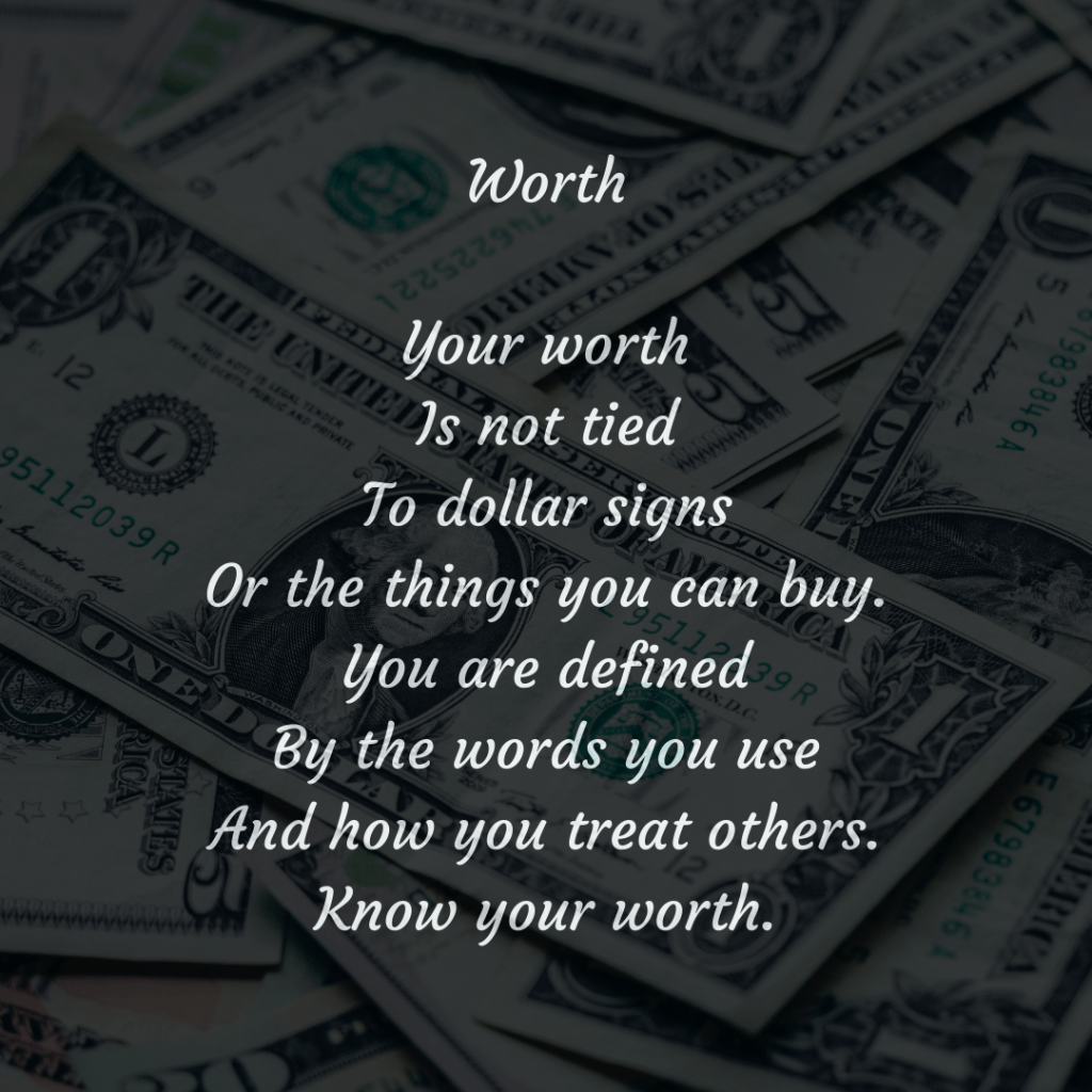 Poem: Worth H.R. Shavor Poetry February 20, 2022January 23, 2022 1 Minute Things to remember. ~H Share this: Click to share on X (Opens in new window) X Click to share on Facebook (Opens in new window) Facebook Like Loading... Related Published by H.R. Shavor Author & poet. Factory worker by day. View all posts by H.R. Shavor Published February 20, 2022January 23, 2022