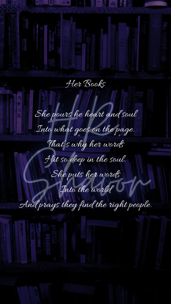 Her Books – Poem H.R. Shavor Poetry December 18, 2024February 11, 2024 1 Minute Share this: Click to share on X (Opens in new window) X Click to share on Facebook (Opens in new window) Facebook Like Loading... Related Published by H.R. Shavor Author & poet. Factory worker by day. View all posts by H.R. Shavor Published December 18, 2024February 11, 2024