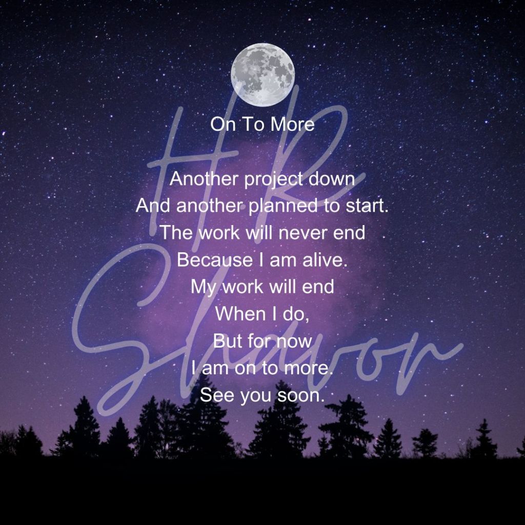 On To More – Poem H.R. Shavor Poetry December 17, 2025November 20, 2024 1 Minute Share this: Click to share on X (Opens in new window) X Click to share on Facebook (Opens in new window) Facebook Like Loading... Related Published by H.R. Shavor Author & poet. Factory worker by day. View all posts by H.R. Shavor Published December 17, 2025November 20, 2024
