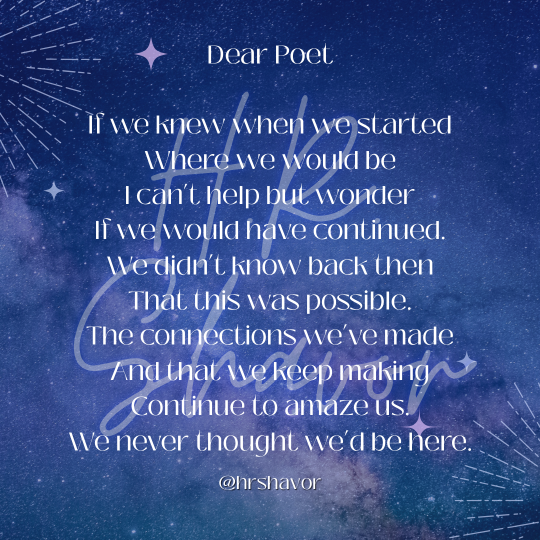Dear Poet – Poem H.R. Shavor Poetry April 15, 2026December 14, 2025 1 Minute Share this: Share on X (Opens in new window) X Share on Facebook (Opens in new window) Facebook Like Loading... Related Published by H.R. Shavor Author & poet. Factory worker by day. View all posts by H.R. Shavor Published April 15, 2026December 14, 2025